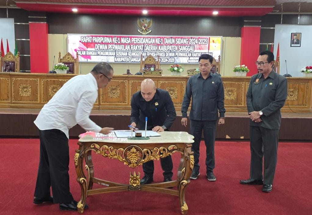 FAKTA GRUP – DPRD Kabupaten Sanggau memiliki tujuh fraksi yakni lima fraksi utuh dan dua fraksi gabungan. Hal itu terungkap dalam rapat paripurna ke-1 dalam rangka pengumuman keanggotaan fraksi-fraksi DPRD Sanggau masa jabatan 2024-2029 di Aula Kantor DPRD Sanggau, Kalimantan Barat, Rabu 9 Oktober 2024.