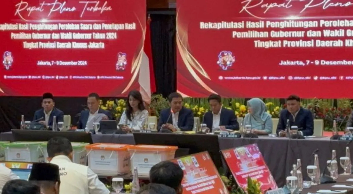“Dengan mengucap Bismillahirrahmanirrahim, berita acara sertifikasi rekapitulasi hasil penghitungan perolehan suara dari setiap kabupaten/kota dalam pemilihan gubernur dan wakil gubernur DKJ 2024, saya nyatakan sah,” kata Ketua KPU Provinsi DKI Jakarta Wahyu Dinata dalam rapat pleno Penetapan Hasil Pemilihan Gubernur DKI Jakarta 2024, Minggu.