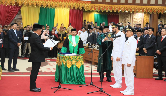 “Dengan ini resmi melantik Saudara Muzakir Manaf sebagai Gubernur Aceh, Saudara Fadhlullah, S.E., sebagai Wakil Gubernur Aceh, berdasarkan Keputusan Presiden Republik Indonesia Nomor 13/P Tahun 2025, tanggal 31 Januari 2025, tentang Pemberhentian Penjabat Gubernur dan Pengesahan, Pengangkatan Gubernur dan Wakil Gubernur Aceh Masa Jabatan Tahun 2025-2030,” kata Mendagri Tito.